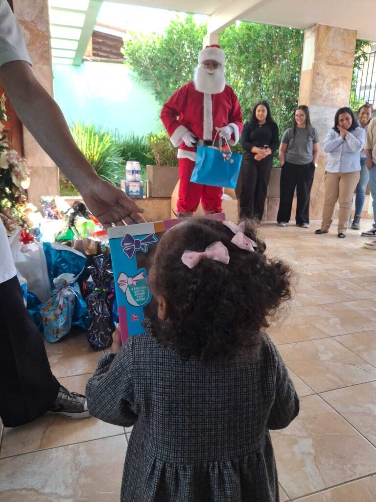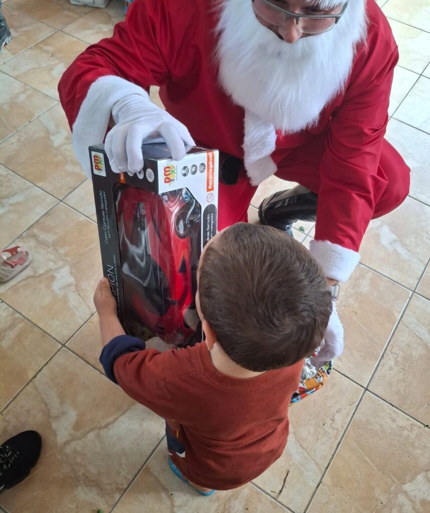 Durante a ação, arrecadamos brinquedos, materiais de higiene (como fraldas e lenços), roupas e organizamos um lanche da tarde especial, com assados e sucos preparados com carinho. Tivemos um momento de convivência e troca com as crianças, que culminou na entrega dos presentes — tudo isso com a presença especial do Papai Noel, tornando o dia ainda mais mágico.